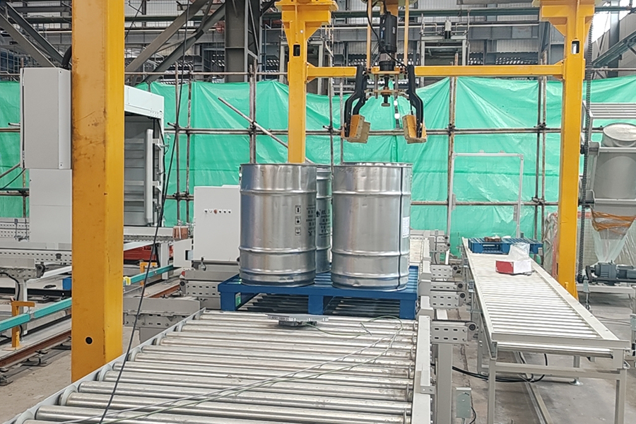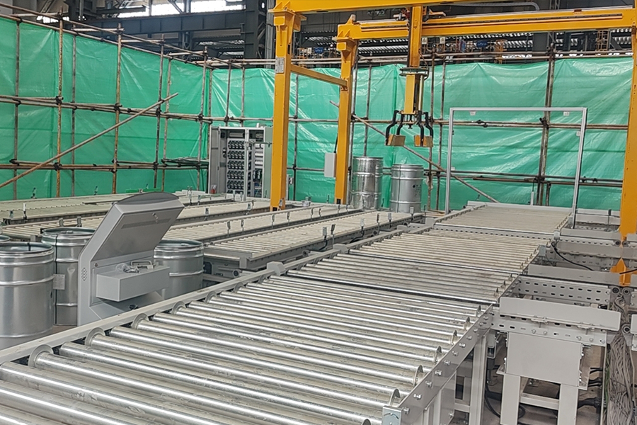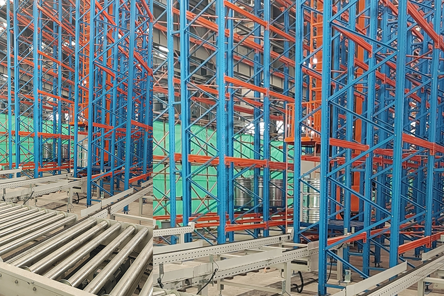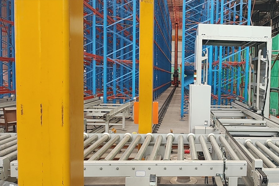 本方案總貨位2688個(雙深位2個巷道,8排28×2列6層),高度9.6m。全套設備由1臺轉彎式雙立柱有軌巷道堆垛機,雙深位雙電機貨叉,4臺鏈條機,5臺輥道機和2臺移載機;2個入庫輥道機中部安裝1套外形檢測裝置、1套稱重裝置和1只固定式條碼掃描器。全部實現自動化處理。